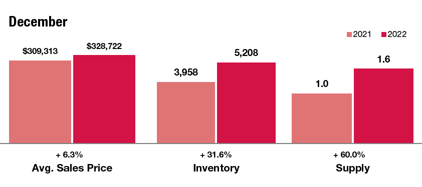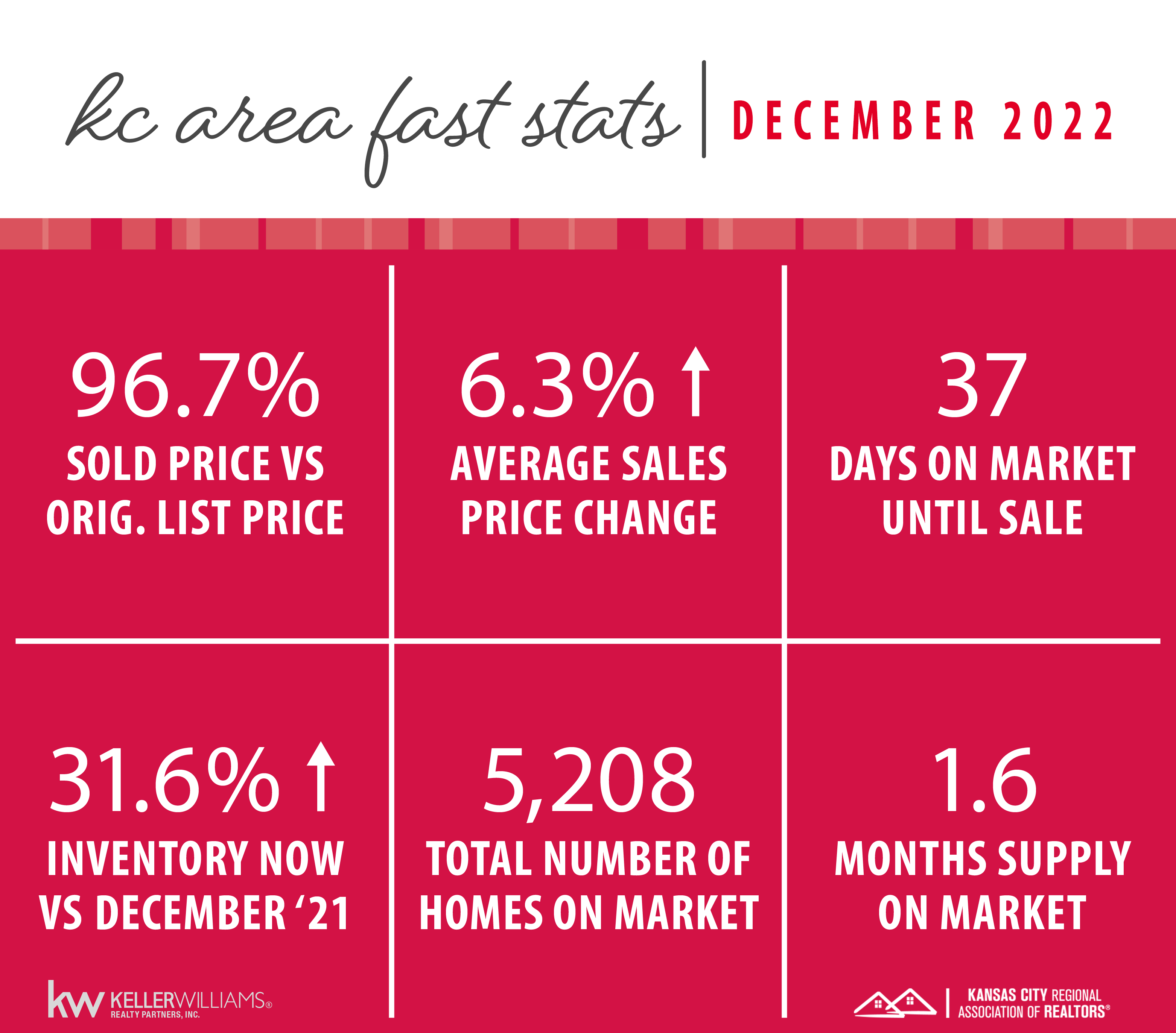 Homes on the market in the Kansas City metro area are selling for an average of 96.7 percent of the original list price. That’s a 3.0 percent decrease from December 2021. Days on the market increased slightly to 37 days in December—compared to 25 days just one short year ago. Supply from the same time last year increased 37.5 percent for existing homes, and increased 84.8 percent for new construction homes, for an increase of 60.0 percent on all of the residential supply combined. That leaves KC with a 1.6 months supply of homes on the market.