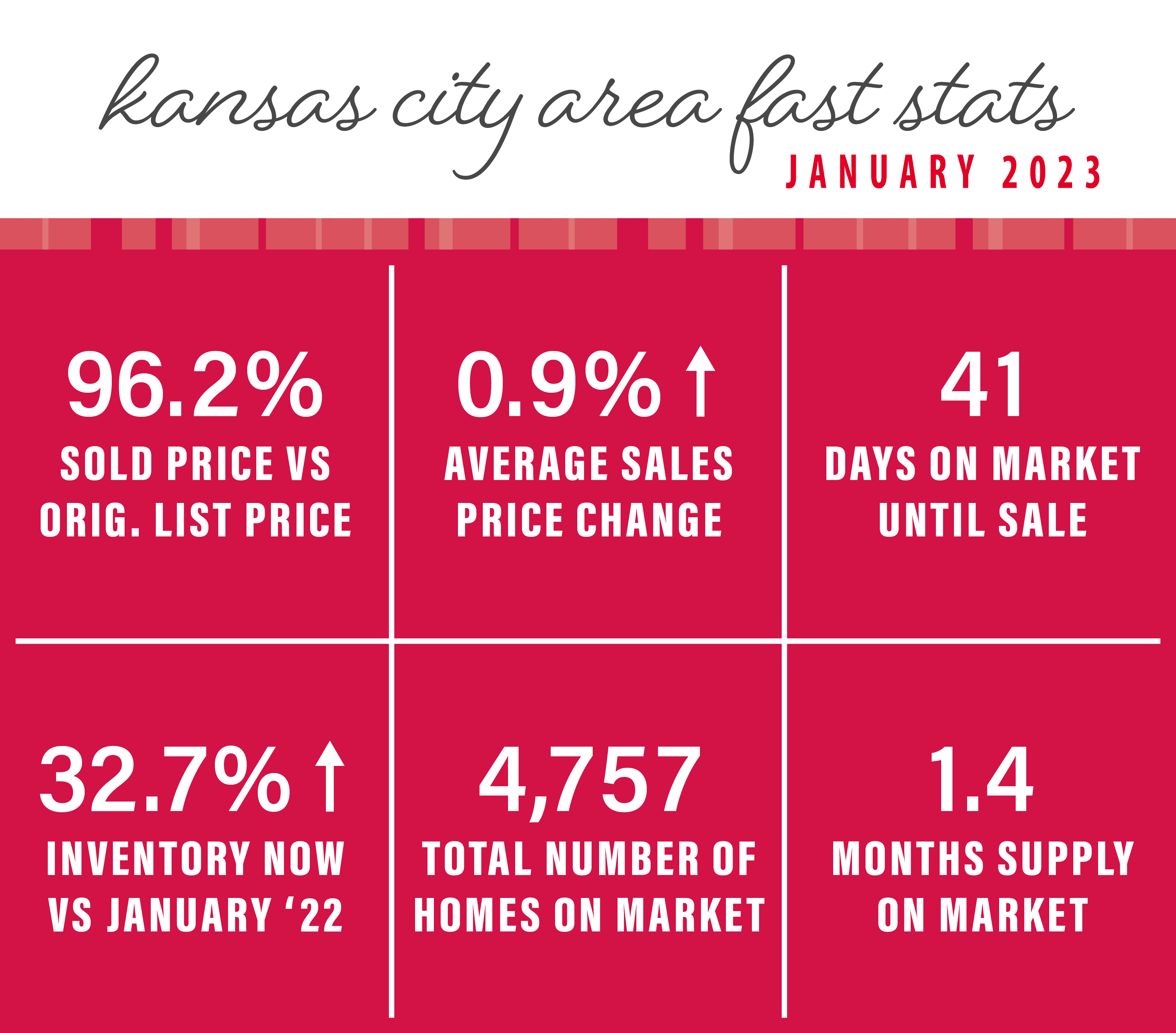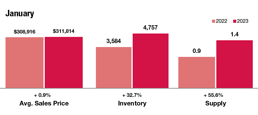 Currently, there are more homes available in our market now than compared to the winter season last year. Looking at the total number of homes on the market a year ago, there were 4,641 in November and 3,958 in December of 2021; and 3,584 in January 2022. More recently, the January 2023 home inventory was at 4,757! We have seen inventory gradually increase in the past year, and we are hopeful that this coming spring will bring moderating interest rates and even more homes on the market in Kansas City.