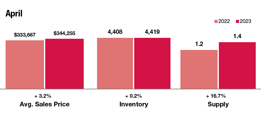 Homes on the market in the Kansas City metro area are selling for an average of 99.9 percent of the original list price. That’s a 3.5 percent decrease from April 2022. Days on the market increased slightly to 38 days in April—compared to 21 days just one short year ago. Supply from the same time last year decreased 10.0 percent for existing homes, and increased 79.4 percent for new construction homes, for an increase of 16.7 percent on all of the residential supply combined. That leaves KC with a 1.4 months supply of homes on the market.