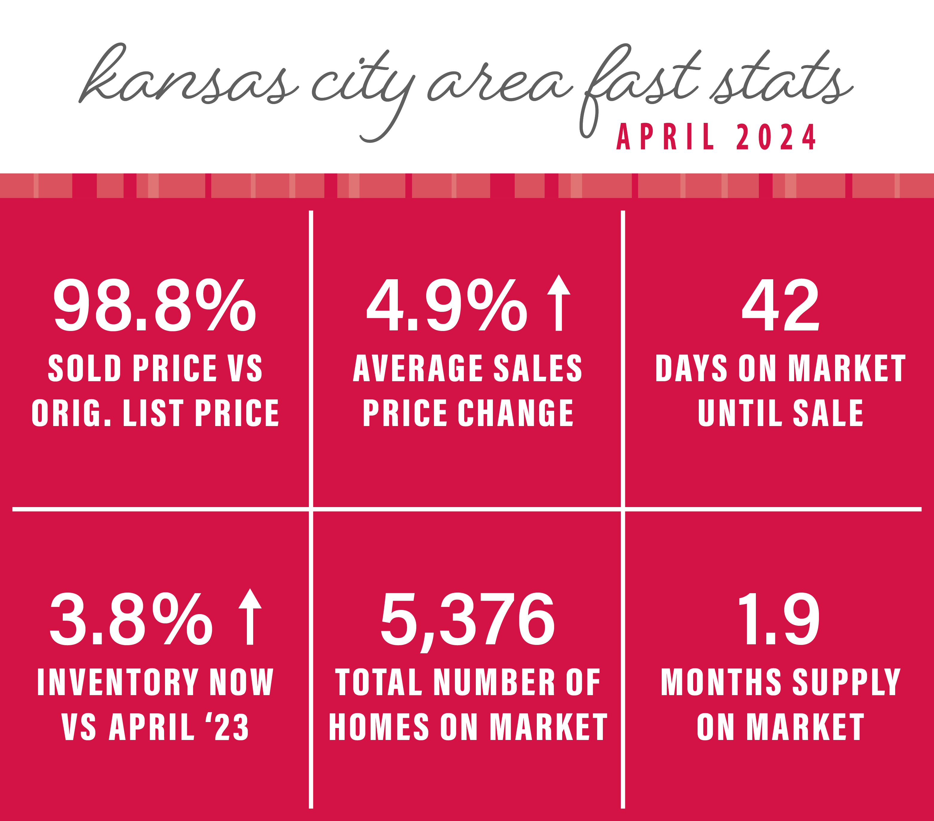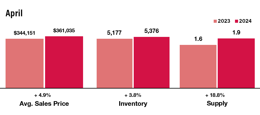 Homes on the market in the Kansas City metro area are selling for an average of 98.8 percent of the original list price. That’s a 1.1 percent decrease from April 2023. Days on the market increased to 42 days in April—compared to 38 days just one short year ago. Supply from the same time last year increased 18.8 percent.